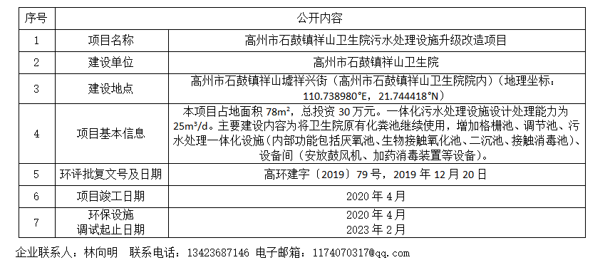 根據(jù)《建設項目竣工環(huán)境保護驗收暫行辦法》第十一條,現(xiàn)對我單位高州市石鼓鎮(zhèn)祥山衛(wèi)生院污水處理設施升級改造項目竣工及環(huán)保設施調(diào)試信息進行公示。如有問題,請向我單位反映。